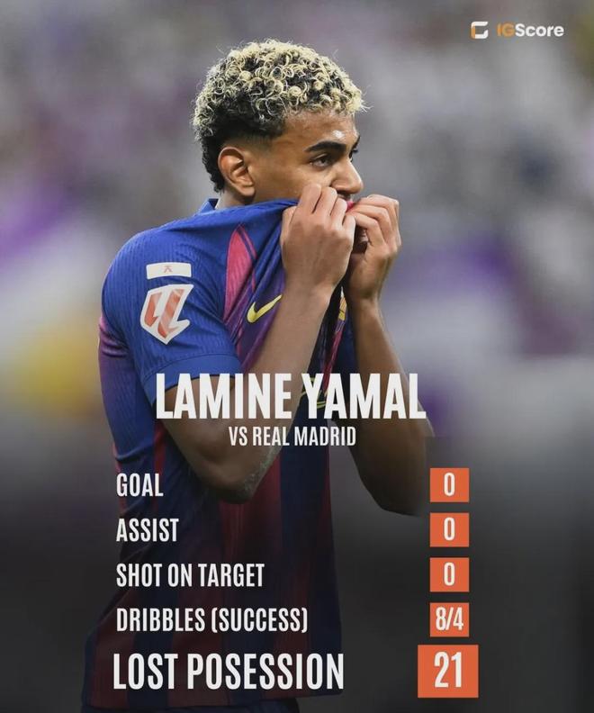 本場(chǎng)國(guó)家德比,亞馬爾的表現(xiàn)可以說完全不如姆巴佩,他全場(chǎng)一共只有2次射門,0次射正,丟失球權(quán)達(dá)到了21次,是全場(chǎng)最高。