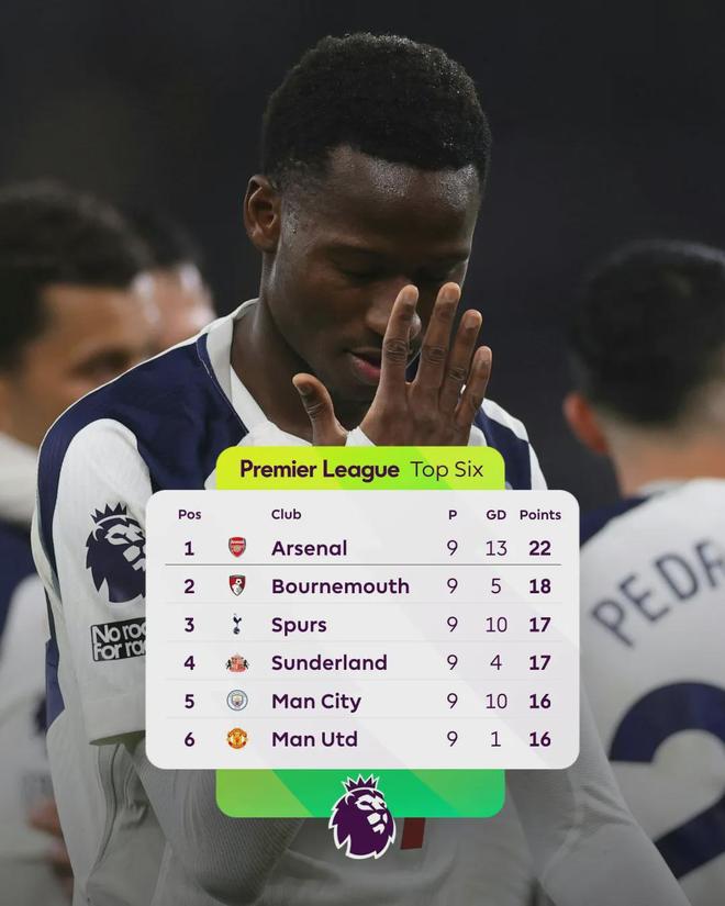 熱刺、桑德蘭排在第3、4位,曼市雙雄同積16分,排在5、6位,利物浦15分,排名第7位。
